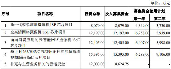 1.新一代模拟高清摄像机ISP芯片项目,投资总额8,079.00万元,投入募集资金8,079.00万元;2.全高清网络摄像机SoC芯片项目,投资总额12,197.00万元,投入募集资金12,197.00万元;3.面向消费应用的云智能网络摄像机SoC芯片项目,投资总额12,405.00万元,投入募集资金 12,405.00万元;4.基于H.265/HEVC视频压缩标准的超高清视频编码SoC芯片项目,投资总额15,395.00万元,投入募集资金15,395.00万元;5.补充与主营业务相关的营运资金,投资总额12,000.00万元,投入募集资金 8,624.75万元。