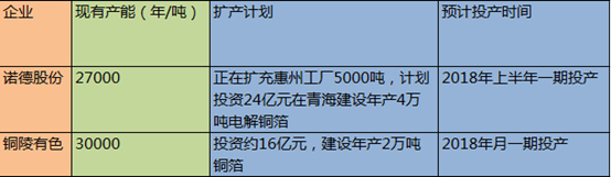 A股两家涉及铜箔生产的企业,其新增产能都排到2018年以后。