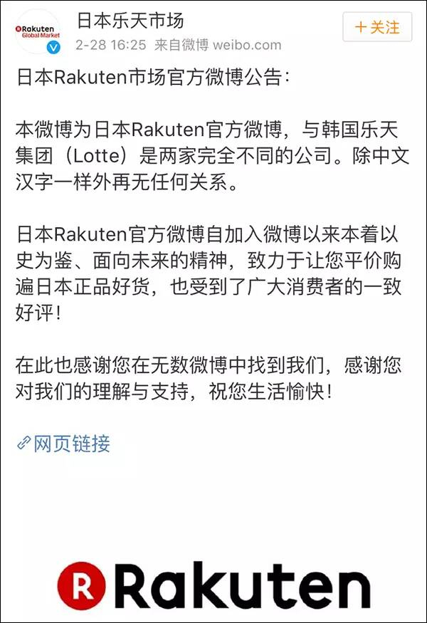 对此,昨天(2月28日)下午,@日本乐天市场 发布微博公告,称@日本乐天市场 为日本Rakuten官方微博,与韩国乐天集团(Lotte)是两家完全不同的公司,只是中文汉字一样,此外再无任何关系。