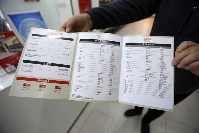 10、店员展示价目表,服务分类包括自助洗衣、烘干和精洗三项。相比传统洗衣店,自助洗衣有较大的价格优势,洗10公斤衣服只要20元,而附近传统洗衣店的价格为26元。