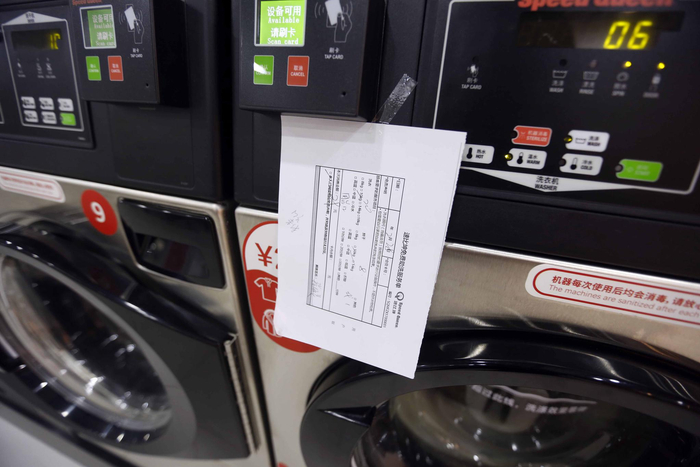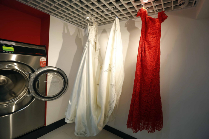 9、有顾客把婚纱礼服送到店内清洗、烘干。对于消费者普遍关心的卫生安全问题,自助洗衣店表示,严格遵守定期清理的规则,每天对洗衣机进行消毒,并愿意接受第三方机构的检测。