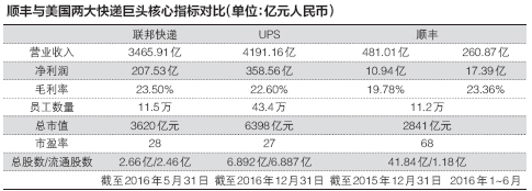 从商业模式上看,顺丰控股对标美股的是联邦快递。根据顺丰控股业绩快报,2016年,顺丰营业收入为574.83亿元。截至3月2日,顺丰控股总市值为2841.14亿元,市盈率68倍。