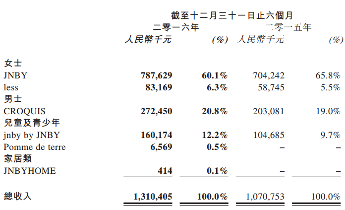 仔细分析收入明细,智通财经观察到,目前,江南布衣的收入仍旧主要依靠女装。截止2016年12月31日止6个月,女装品牌JNBY、less收益合计8.70亿元,合计占总收益的66.4%;男装品牌CROQUIS,儿童品牌jnby by JNBY、Pomme de terre分别占总收益的20.8%,12.2%、0.5%,分别达到2.72亿元,1.60亿元、657万元。而新创立的家居品牌“JNBY HOME”则表现并未达到业界预计。期内,home 家居系列的销售额仅为 41 万元。