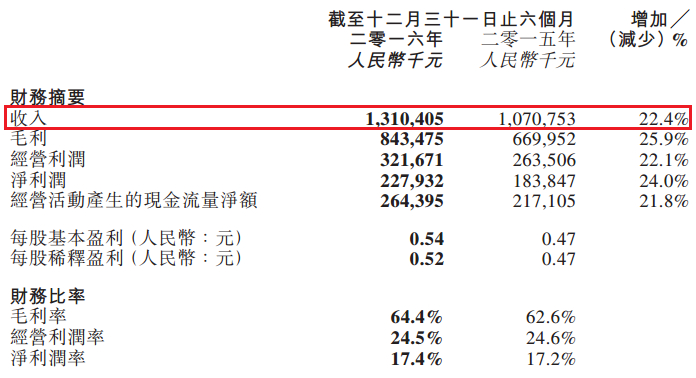 财报显示,截至2016年12月31日止6个月,江南布衣实现收入约13.1亿元人民币(单位下同),同比增长22.4%;毛利同比增长25.9%至8.43亿元;每股基本盈利0.54元,不派息。
