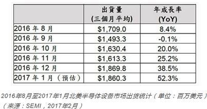 2017年1月北美半导体设备制造商出货金额为18.6亿美元,较去年同期增长52.3%。而日本半导体制造设备BB值较前月上扬0.09点至1.39,连续第4个月呈现上扬,连续第4个月突破1,且创11个月来新高。