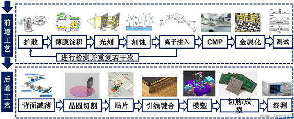 值得注意的是,在半导体产品生产中,可以分为前工序和后工序两个步骤。前工序是以硅片加工为起点,以在硅片等介质上制成集成电路为终点。后工序是以分割载有集成电路的硅片为起点,以封装和测试后并最终制成集成电路产品为终点。