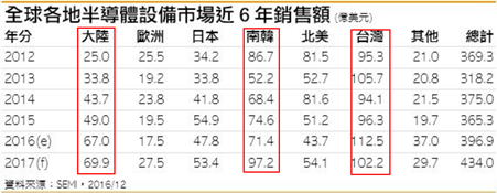 据SEMI估计,2016 年芯片设备的市场规模约397亿美元,大陆占67 亿美元。2017 年全球市场规模可望达到434亿美元,大陆占比也将增加至70亿美元,预计2018 年将超过100亿美元,有望超越韩国。