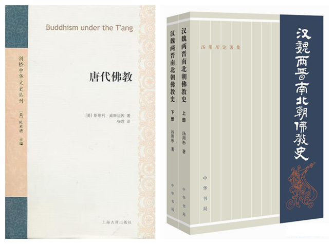 威斯坦因著《唐代佛教》,上海古籍出版社2010年8月版(左),汤用彤著《汉魏两晋南北朝佛教史》(右)