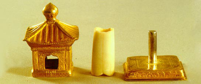 佛指骨舍利是佛陀释迦牟尼佛的一节中指骨火化后的遗物,因为象征着“遗教不灭”,并具有灵验性,遂成为圣物。早在中唐,法门寺的佛指骨舍利就曾在长安引起轩然大波。1987年法门寺重建时,发现了护国真身塔塔基地宫,埋藏其中的佛指骨舍利又重见天日。