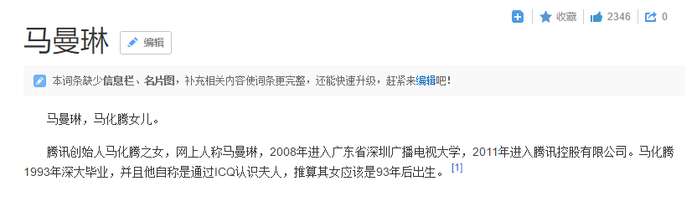 6.马化腾对于“鹅厂”创始人马化腾的女儿,网友的猜测一直没有间断。百度百科只有这样一个语焉不详也未经证实的词条↓