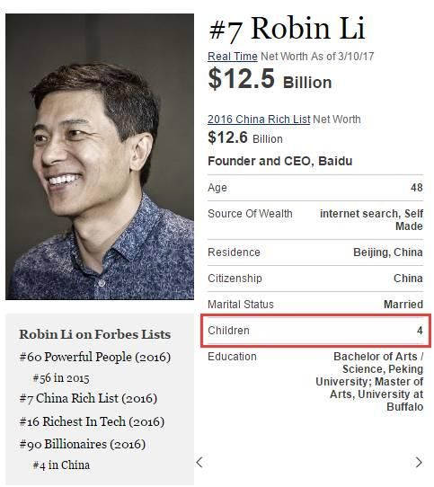不过,据福布斯富豪榜的资料显示,李彦宏有4个孩子……另外3个孩子是公子还是千金,我们不得而知。