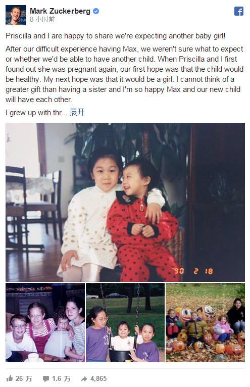 小扎在文中表示:“(对Max来说)我想不出比有个妹妹更好的礼物了,她们将相互陪伴,我很高兴。”