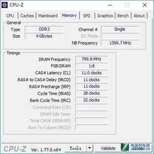 为了方便进行比较本次笔者还选择了一款芝奇的4G DDR3 1600内存进行比较,由于条件所限,笔者在整个DIY部门仅仅找到这么一根DDR3 4G内存,仅供玩家进行对比参考。首先我们来使用CPU-Z看一下款内存的基本信息。