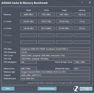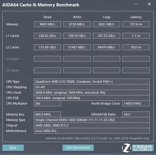 下面我们用AIDA64对平台的内存性能进行测试,AIDA64内存带宽测试项目主要包括内存的读取、写入、拷贝和延迟参数,并提供全方位的硬件信息的检测功能,方便用户知晓平台硬件配置的准确信息。
