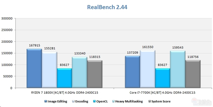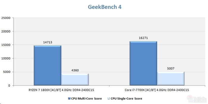 GeekBench 4:Ryzen单线程、多线程分别慢了12%、10%,多线程表现仍然相对一些。