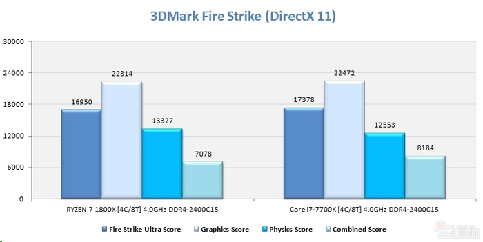 3DMark Fire Strike:Core i7总分略高,但是物理测试Ryzen表现不错。