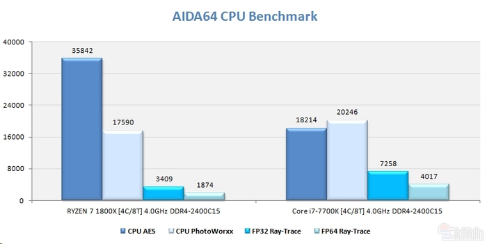AIDA64 CPU:ASE项目上Ryzen领先了足足一倍,但其他项目依然略微落后。