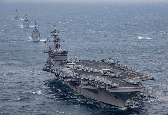 3月9日,美国海军尼米兹级核动力航空母舰“卡尔-文森”号(CVN 70)和多艘伯克级导弹驱逐舰及两艘日本海上自卫队的高波级驱逐舰在东海组成编队航行。