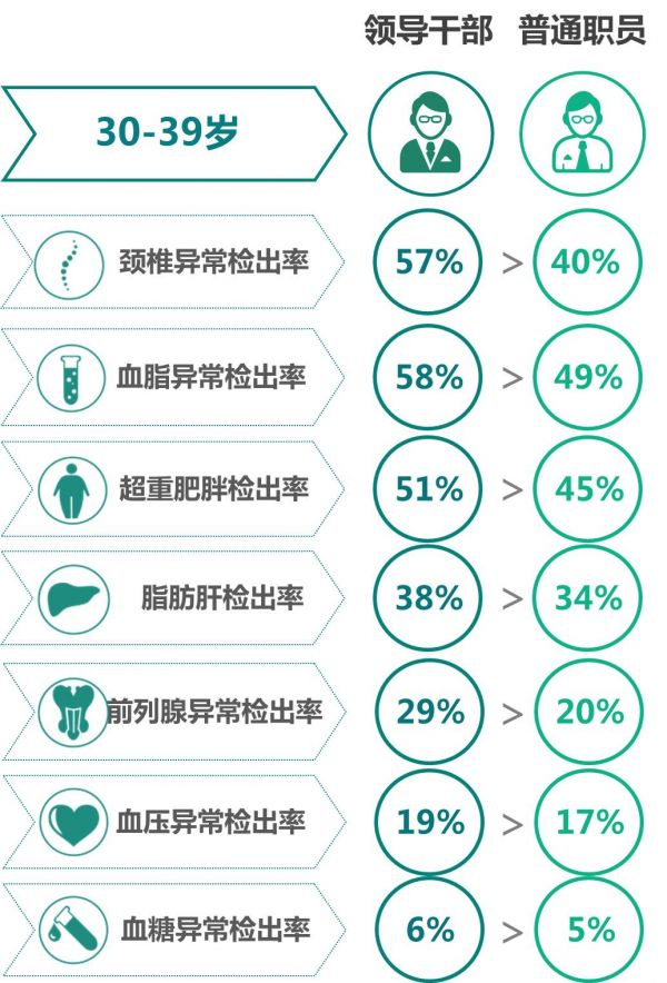 综合已有的公务员健康状况相关报道及爱康的体检指标异常率数据,爱康的统计数据显示,目前公务员发生率较高的疾病主要有颈椎疾病、高血脂、脂肪肝、高血压、糖尿病、体重超标和前列腺疾病等。而这些疾病的相关体检指标在领导干部的体检样本人群中异常率都高亍普通职员,其中,颈椎异常的差异最大,相差21个百分点;血糖异常率的差异最小,仅为0.3个百分点。