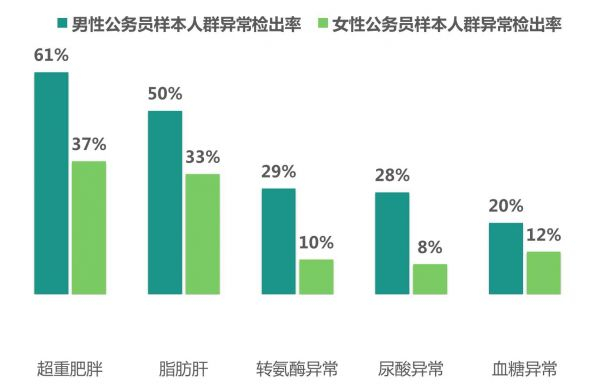 爱康的调查统计还显示,公务员健康状况呈“阴盛阳衰” 态势。