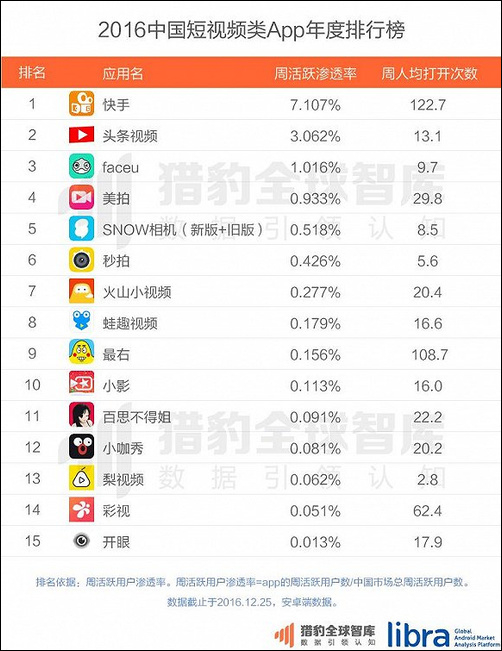 2016中国短视频类App年度排行榜