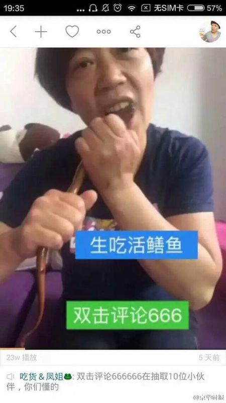 2016不愧“直播之年”,快手上走红的主播一个接一个。这位“吃货凤姐”,自称兴趣爱好为“吃点一般人不能吃的东西”。再看表演内容,全是活吞金鱼、生吞灯泡、生吃活鳝鱼、生吃虫子……