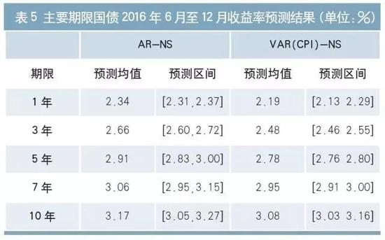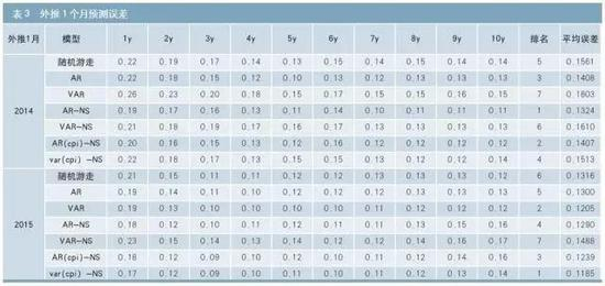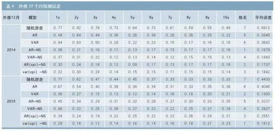 由表3和表4可知:(1)基于N-S的国债收益率曲线预测模型的预测效果要好于随机游走模型和单纯预测收益率的AR和VAR模型,特别是在外推12期预测中。(2)在不同预测样本期,基于N-S的不同预测模型表现略有差异。其中,在外推12期的预测中,AR-NS模型在2014年的预测误差最小,为17BP;VAR(CPI)-NS模型的预测误差为18BP,与其相差不大。VAR(CPI)-NS模型则在2015年的预测误差最小,为18BP,显著好于其他模型;在外推1期的预测中,其与AR-NS模型预测误差相差无几,但在外推12期预测中,则显著好于AR-NS模型。