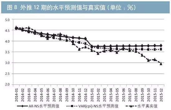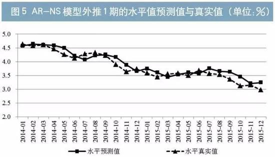 在实际预测中,考虑到CPI作为外生变量本身存在的预测误差,我们在外推1期预测中仅采用AR-NS模型;在外推12期预测中,则同时采用VAR(CPI)-NS和AR-NS两个模型并对比各自的结果。