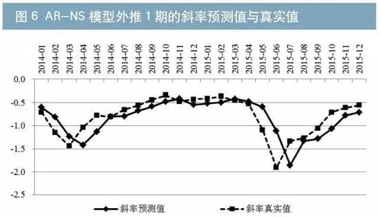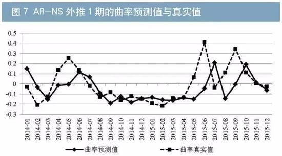 其次,本文采用AR-NS模型外推1期预测收益率曲线的水平值、斜率和曲率。结果显示模型预测值的走向趋势与实际值大体一致(如图5至7所示)。分项看,2014年、2015年曲线水平值的年平均预测误差分别为12.67BP、16.27BP;斜率的年平均预测误差分别为17.54BP、25.77BP;曲率的年平均预测误差分别为9.61BP、14.89BP。
