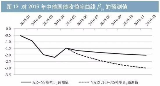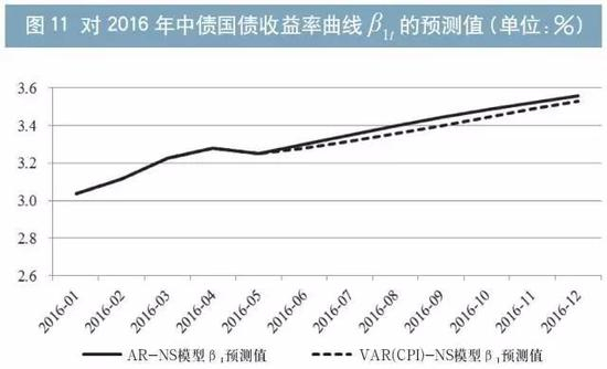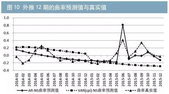 分模型看,AR-NS模型在2014年、2015年曲线水平值的年平均预测误差分别为15.82BP、34.70BP;斜率的年平均预测误差分别为32.89BP、26.97BP;曲率的年平均预测误差分别为11.35BP、12.56BP。VAR(CPI)-NS模型在2014年、2015年曲线水平值的年平均预测误差分别为13.81BP、22.77BP;斜率的年平均预测误差分别为34.17BP、35.37BP;曲率的年平均预测误差分别为20.24BP、27.32BP。从测试结果来看,VAR(CPI)-NS在水平值预测中更优,而AR-NS在斜率和曲率预测中更优,故本文在外推12期预测中,依然同时综合参考两个模型的预测结果。