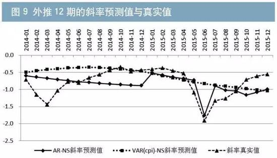 最后,本文采用AR-NS模型和VAR(CPI)-NS模型,外推12期预测收益率曲线的水平值、斜率和曲率。结果显示,模型预测值的走向趋势与实际值大体一致(如图8至图10所示)。