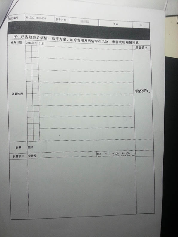 据陈先生描述,四个月后,2016年7月31日,冯丽敏陪同陈先生母亲就医,做了牙科的“全景片”检查,支付了检查费用并签名。该检查后,双方因“种牙”与否以及费用承担问题产生分歧。