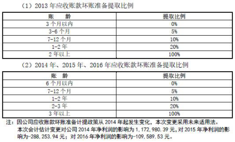 此外,公司在2014年进行了会计估计变更。2013年之前,公司对账龄3至6个月的应收账款按5%计提坏账准备,对7至12个月的应收账款按10%计提坏账准备,1至2年的账龄计提比例20%,2年以上账龄计提比例为100%。2014年后,应收账款计提比例变更为,7至12个月的应收账款按5%计提坏账准备,1至2年的账龄计提比例10%,2至3年账龄计提比例为20%,3年以上计提100%。