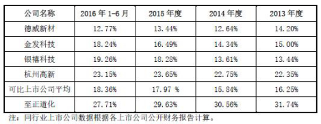 2013年至2016年,至正股份的毛利率分别为31.74%、30.56%、29.63%、27.33%,逐年下降但仍远高于同行业上市公司。2013年至2016年6月,同行业可比上市公司毛利率平均值为16.25%、15.84%、17.97 %、18.36%。