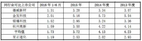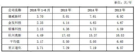 2013年至2016年1-6月同行业可比上市公司存货周转率(来源:招股书)