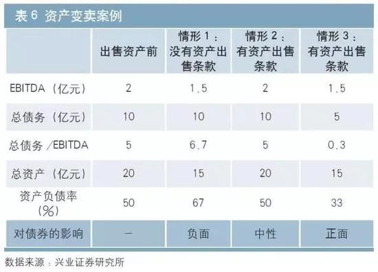 情 形3:发行人变卖资产,并用这部分收益偿还债务。若资产变卖限制条款规定发行人应将变卖资产的收益优先用于偿还债务,此种情形下尽管收益无法进行再投 资,EBITDA会下降,总资产也会下降,但由于能够减少债务,可以降低杠杆比率和资产负债率,对债券而言影响是正面的,可以最大程度保护投资者利益。