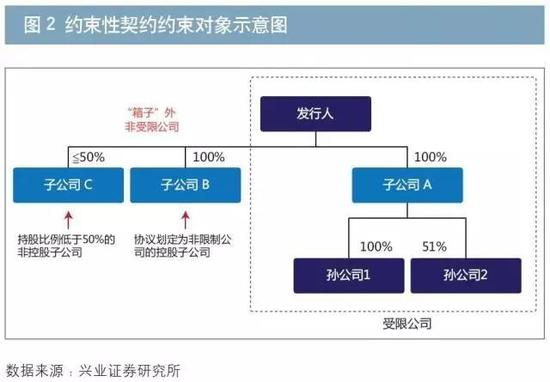 约 束性契约约束“箱子”内的企业。约束性契约意味着:(1)契约不仅对发行人自身进行约束,还对发行人的部分关联方产生约束,即使发行人为债券协议的唯一签 署人。(2)“箱子”的圈定可以通过协商,即使是控股子公司,也可以被划入“箱子”外部。这种情形常见于新设子公司,这类公司由于创业阶段融资需求较大, 发行人倾向于将其划入非受限公司,以保证其可以不受合约条款约束,为自身成长获得充足融资。
