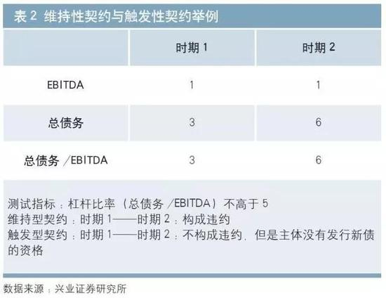 触 发性契约:监控发行人的交易能力,不符合测试规定,则不能进行新的交易(如继续举债),但不当做违约。触发性契约给予发行人更大的宽容度,发行人不满足测 试条件时,其特定行动(如再举债、支付现金、出售资产)会受到限制,但不被判定为违约。例如,某触发性契约的表述为:发行人能够额外举债的条件是杠杆比率 (总债务/EBITDA)不高于5。这实际上是一条债务限制条款。假定发行人财务指标如表2所示,则在时期1,发行人杠杆比率为3,尚可以进行额外举债, 但在时期2,杠杆比率达到6,发行人失去继续借贷的资格,但并不构成违约。