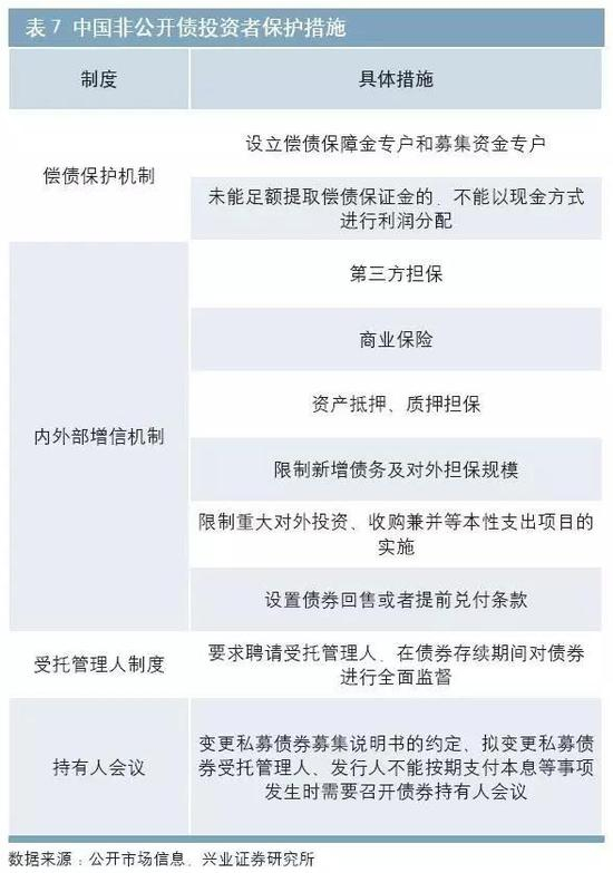 中 国非公开债投资者保护体系大体包括以偿债保证金专户为主要内容的偿债保护机制、受托管理人制度、持有人会议和无强制要求的内外部增信机制(包括第三方担 保、商业保险、限制新增债务等,见表7)。可以说,中国非公开债几乎无严格的限制性条款,类似美国高收益债约束性契约中债务限制条款、限制性支付条款的版 本直到2015年5月才首次出现在《深圳证券交易所非公开发行公司债券业务管理暂行办法》中,且仅作为“内外部增信机制”的备选项供条款设计选择。