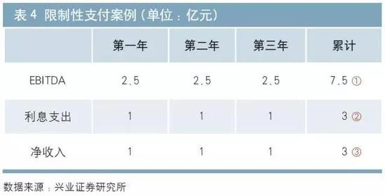 情形2:若限制性条款为允许超过1.5倍累计利息覆盖率的部分进行现金支付,则限制性支付项目值=超过1.5倍累积利息覆盖率的部分=①7.5亿元-1.5×②3亿元=3亿元