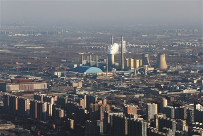 2016年12月22日,从国贸高楼俯瞰供暖期的华能北京热电厂。新京报记者 薛珺 摄