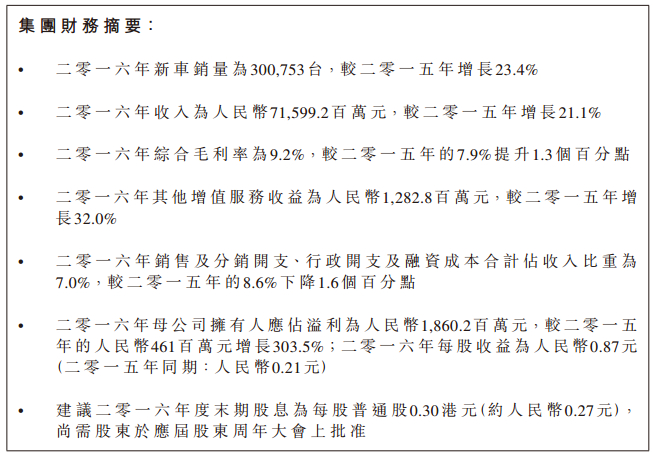 3月20日,中升发布了2016年财报,收入716亿元人民币(单位下同),同比增长21.1%,净利润大增303.5%达18.6亿元。