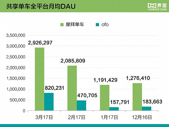 根据极光大数据提供的数据显示,在今年已经过去的三个月里,摩拜单车的DAU仍然领先ofo 3.5倍: