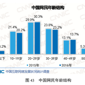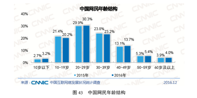 《中国互联网络发展状况统计报告》提到,目前中国网民规模达7.31亿,新增网民年龄呈现两极化趋势,19岁以下、40岁以上人群占比分别为45.8%和40.5%,互联网向低龄、高龄人群渗透明显。网民中学生群体规模最大,截至2016年12月,学生群体占比25%。