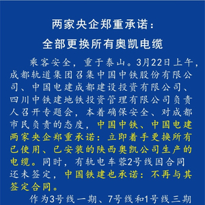 中国经济网北京3月22日讯 据成都地铁官方微博消息,今日上午,成都轨道集团召集中国中铁股份有限公司、中国电建成都建设投资有限公司、四川中铁建地铁投资管理有限公司负责人召开专题会,中国中铁、中国电建两家央企郑重承诺:立即更换所有已使用、已安装的陕西奥凯公司生产的电缆。同时,有轨电车蓉2号线因合同还未签定,中国铁建也承诺:不再与其签定合同。