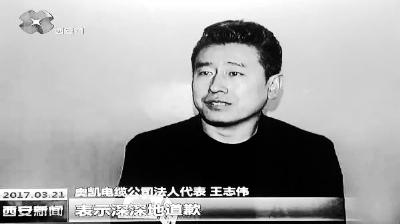 在西安电视台播出的画面中奥凯电缆公司负责人王志伟跪地道歉(视频截图)