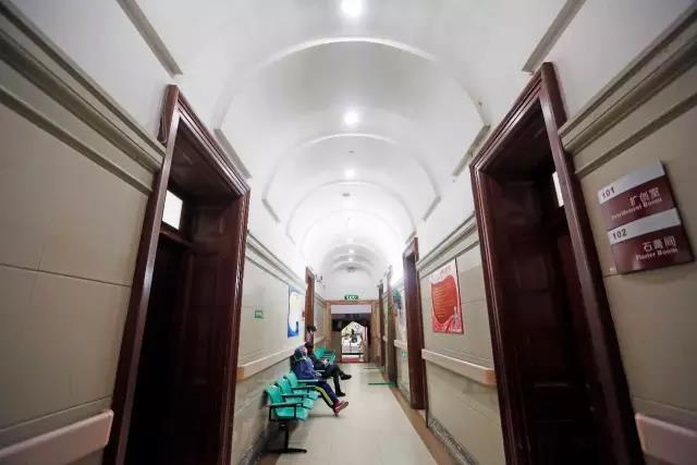 ▲美孚洋行旧址,也就是现在的黄浦区中心医院急诊部内景,患者在走廊里候诊。