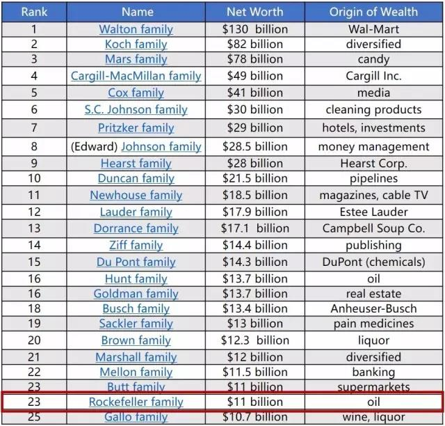 ▲ 福布斯美国最富有家族排行榜,洛克菲勒家族排在第23位