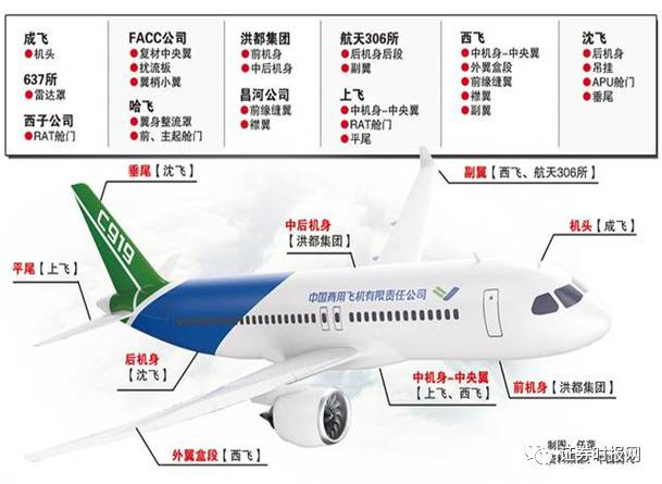 C919大型客机的机体结构主要包含机头、前机身、中机身-中央翼、外翼、副翼、中后机身、后机身、垂尾、平尾等,其中,中航工业集团旗下的成飞、洪都、西飞、沈飞、哈飞公司等承担了C919飞机大部件的主要制造任务。比如,机头由成飞公司制造,前机身和中后机身由洪都集团制造,机翼由西飞公司制造,后机身和垂尾由沈飞公司制造,前、主起舱门由哈飞公司制造。