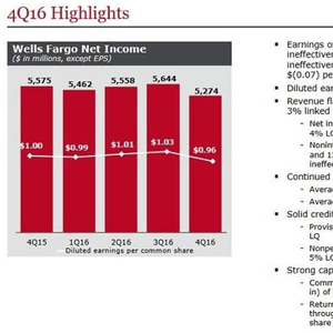 富国银行2016年第四季度每股盈利下跌6.8%。不足为奇,2016年小摩表现优于富国银行。